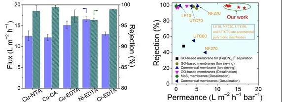 針對上述問題,張煒銘、潘丙才教授課題組借鑒納米仿生思路,首次提出通過軟物質插層劑構建類似水通道蛋白通道的新策略。研究以實現污廢水中重金屬絡合物的高效分離與水質凈化為最終目標,首先制備出聚丙烯腈凝膠軟粒子(PAN GPs,1-8nm)作為氧化石墨烯(GO)膜的納米級插層劑,通過控制GO膜層間PAN GPs形變、溶脹以及PAN GPs-π作用實現了亞納米尺度的層間距離精確調控,與此同時GO膜規整的層狀結構得以充分保留。此外,通過堿性處理可在PAN GPs表面產生電荷和雙疏水/親水性,有機融合了水通道截留性與水的快速滲透,成功構建出類似水通道/蛋白通道結構。研究結果表明,該GO復合膜可截留96%以上的重金屬絡合離子(Cu-NTA、Cu-CA、Cu-EDTA、Ni-EDTA、Cr-EDTA),水通量是文獻報道同類膜的4-13倍。這一研究深入探究了納米級軟顆粒插層劑與氧化石墨烯薄片之間的相互作用及其高水通和高截留的限域分離構效機制,提出的軟顆粒插層策略有望成為設計和研制高性能水處理二維復合膜的新方向。